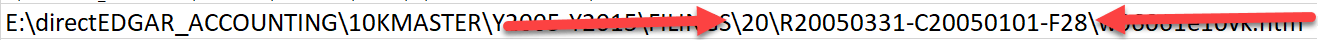 Use the Excel Text-to-Columns tool to separate the path components and then concatenate the CIK and the RDATE-CDATE-F## value – so your new variable will be 20-R20050331-C20050101-F28. That value is in the auditor_details.csv file as shown in the cropped image below: